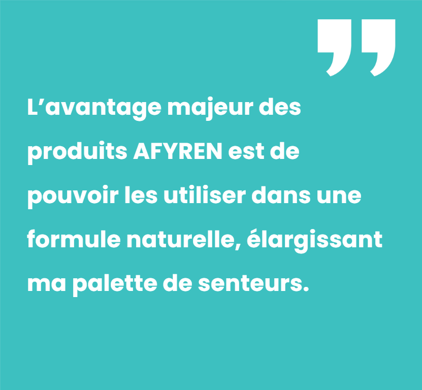 Je n’ai pas comparé ces produits à leur homologue synthétique, mais ils ont apporté toute la performance que je souhaitais. L’avantage majeur des produits proposés par AFYREN est de pouvoir les utiliser dans une formule naturelle. Cela élargit ma palette de senteurs accessibles.